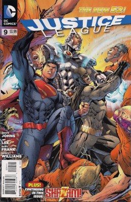 Aquaman is absent this issue, while Cyborg may as well be … he doesn’t seem to have the personality of the classic incarnation. Heck, Booster Gold’s robot pal Skeets could fill his role as team GPS system, but with a spot of wit. Even on Jim Lee’s admittedly cluttered cover, he looks like a spare part. Let’s hope Vic Stone comes out of his metal shell soon.