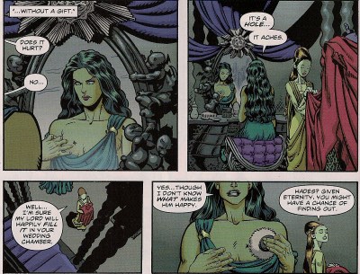 That’s two pages wasted, unless you enjoy viscera flying at you. Look, we get it, the gods must be crazy. We’re nine issues into this run of Wonder Woman and know Hermes isn’t the only mercurial Olympian, they’re all a sandwich short of a picnic. Even more gods show up this time, as the royal family members discuss whether or not to attend the nuptials. Aphrodite, goddess of beauty and apparently too zoftig to be properly shown on panel, isn’t going because there’s no room in hell for Love. Hubby Hephaestus is accepting his invite, and taking demi-god Lennox as his Plus One. Eros is going too, while Hermes stays on Earth to protect the human Zola, who’s carrying Zeus’s child.Β Persephone, self-harming first wife of Hades, has no choice but to be there.