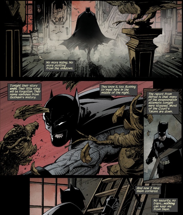 It’s fun to speculate, and it’s fun to read this story. Batman gets some cool moments, particular in the opening scene, which sees him scare a rich biddy connected to the Court. His remembering a lesson from the detective Henri Ducard works well. The slow revelations of Lincoln /Thomas seem corny, like a bad episode of Murder She Wrote, but that’s him giving Bruce time to escape bonds while he puts on his Talon drag. But my favourite scene is a conversation between Bruce and Alfred – an orphan he may be, but there’s no denying Bruce has a father around. This sequence also shows Bruce has a concentration aid that makes lots of sense, given his ghoulish sensibility and collector mania (look at the Batcave and tell me the guy isn’t an especially morbid fanboy!).