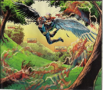 The scene with Hawkgirl and the yet-unnamed Flash is entertaining, with some zingy dialogue. I’m not keen on how it ends, though, with Nature itself under attack. Yes, it’s old Swamp Thing menace The Grey, summoned to new wickedness by the appointment of a new champion of The Green. I’m already a tad bored with a year’s worth of Animal Man and Swamp Thing stories having been taken up with the spat between The Green, The Red and The Rot, and I don’t want more of the same here. Earth 2 should have its own flavour, not be echoing Earth Prime, or 1, or whatever the main New 52 world is called.