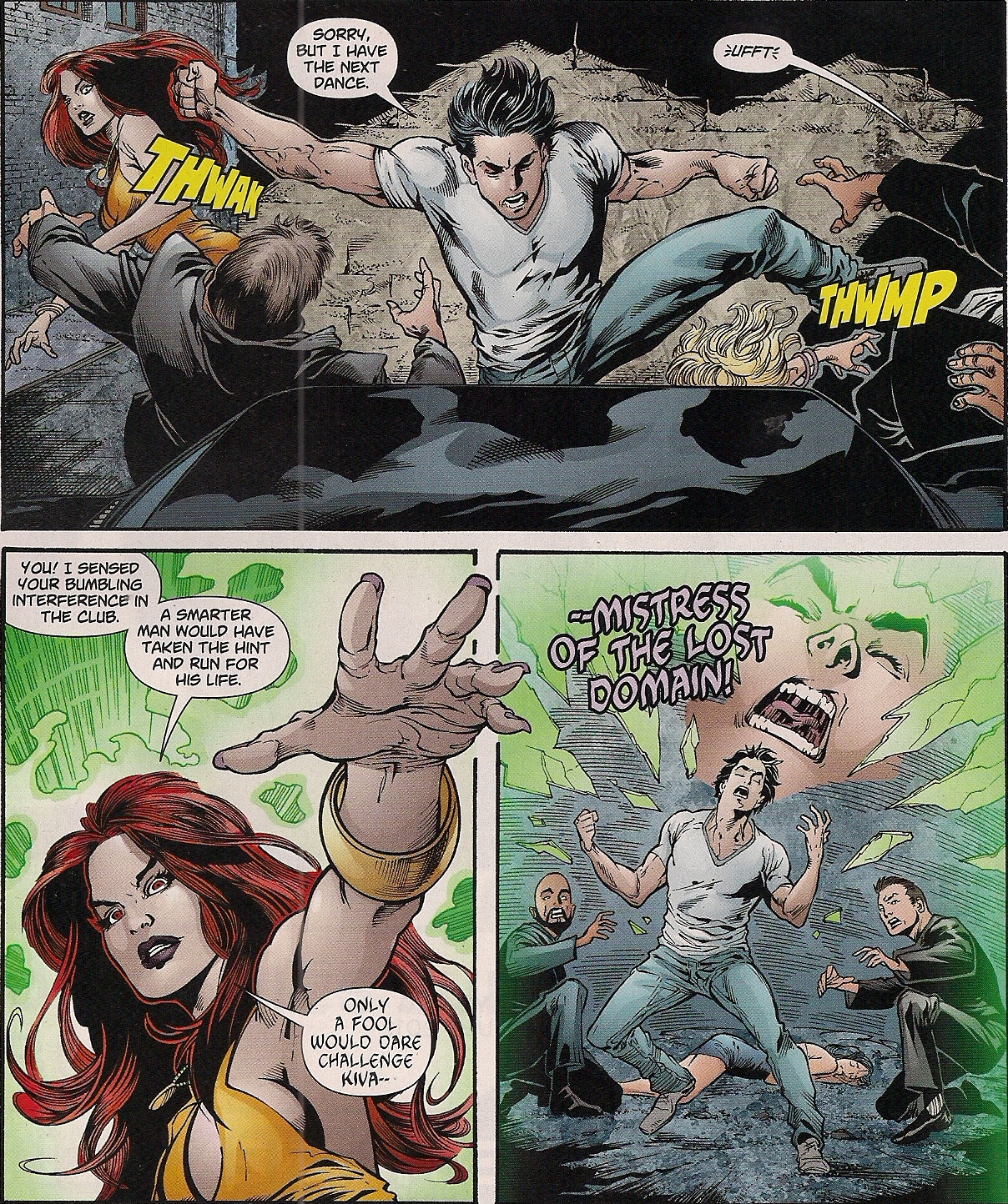 Credit also needs to go to inkers Greg Adams, Mariah Benes and Andy Owens, for sharp finishing. With so many hands on deck this issue could have wound up a mess, but it’s a good-looking whole; colourists Richard and Tanya Horie also deserve credit, for setting the mood for everything from a laser-lit nightclub to a savage land via a dirty back alley. Kiva’s spooky voice comes courtesy of Travis Lanham’s eye for fonts. There’s even that rarity among DC’s New 52 books: a double-page spread that earns its keep by advancing the story and looking pretty spectacular.