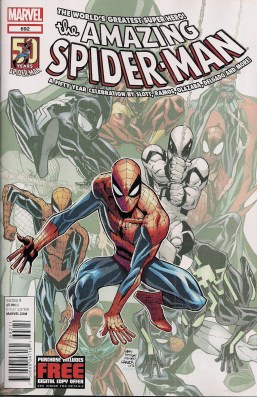 I’ve been away from Amazing Spider-Man for a few months – too many extended storylines, new costumes, the $3.99 price point … but I do like an anniversary issue, and this one marks 50 years since Amazing Fantasy #15 saw Peter Parker gain his powers.