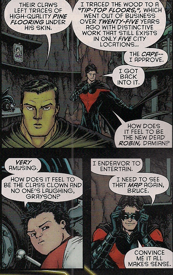 Appreciate that Morrison has enough respect for the reader's intelligence that everything isn't spelled out–e.g. he lets us know Dick was posing as Batman, but assumes we can figure out the identities of “Matches Malone's” three henchmen without help.