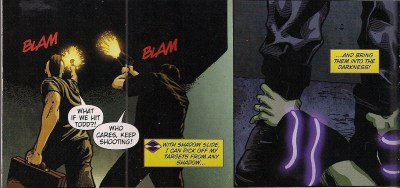 The new Phantom Lady’s powers are reminiscent of DC’s Nightshade character, which seems a shame – I want Nightshade to show up in this New 52 continuity and it doesn’t help if someone else is stealing her gig. I’m curious to see if Gray and Palmiotti actually tie Jennifer to Nightshade in some way. The shadow slide I could do without, the way they extend her arms is too oddball for superhero noir (click on image to enlarge).