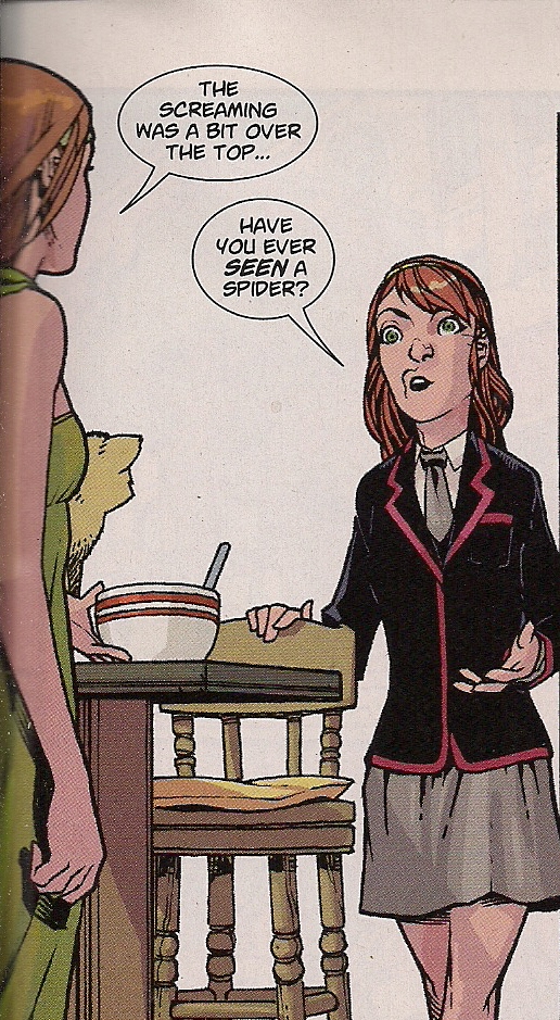 The art by Neil Googe really isn’t my cup of tea. Rose is so skinny as to seem anorexic, the kids at school are lollipop-headed weirdos and the faces … it’s not just that they’re inconsistent, there are panels in which features appear to be trying to escape their surrounds (left). One character laughs and her mouth could give the Joker a run for his money. And Googe does this weird thing with noses that makes it look as if folk are pressing against glass.