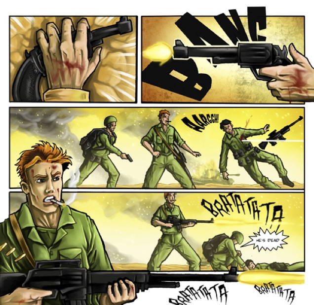 Arifin’s figurework can be a little stiff, proportions skew whiff, and facial tones uneven – but the storytelling is fine and I appreciate an artist who cares enough not to stint on backgrounds. And his Korea battle scene is very nicely done. The lettering is far too small for the balloons, and there are a few spelling errors, but nothing that detracts from the story. More proofreading, though, lads.
