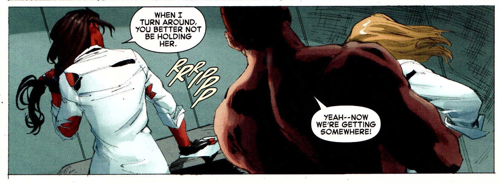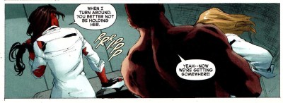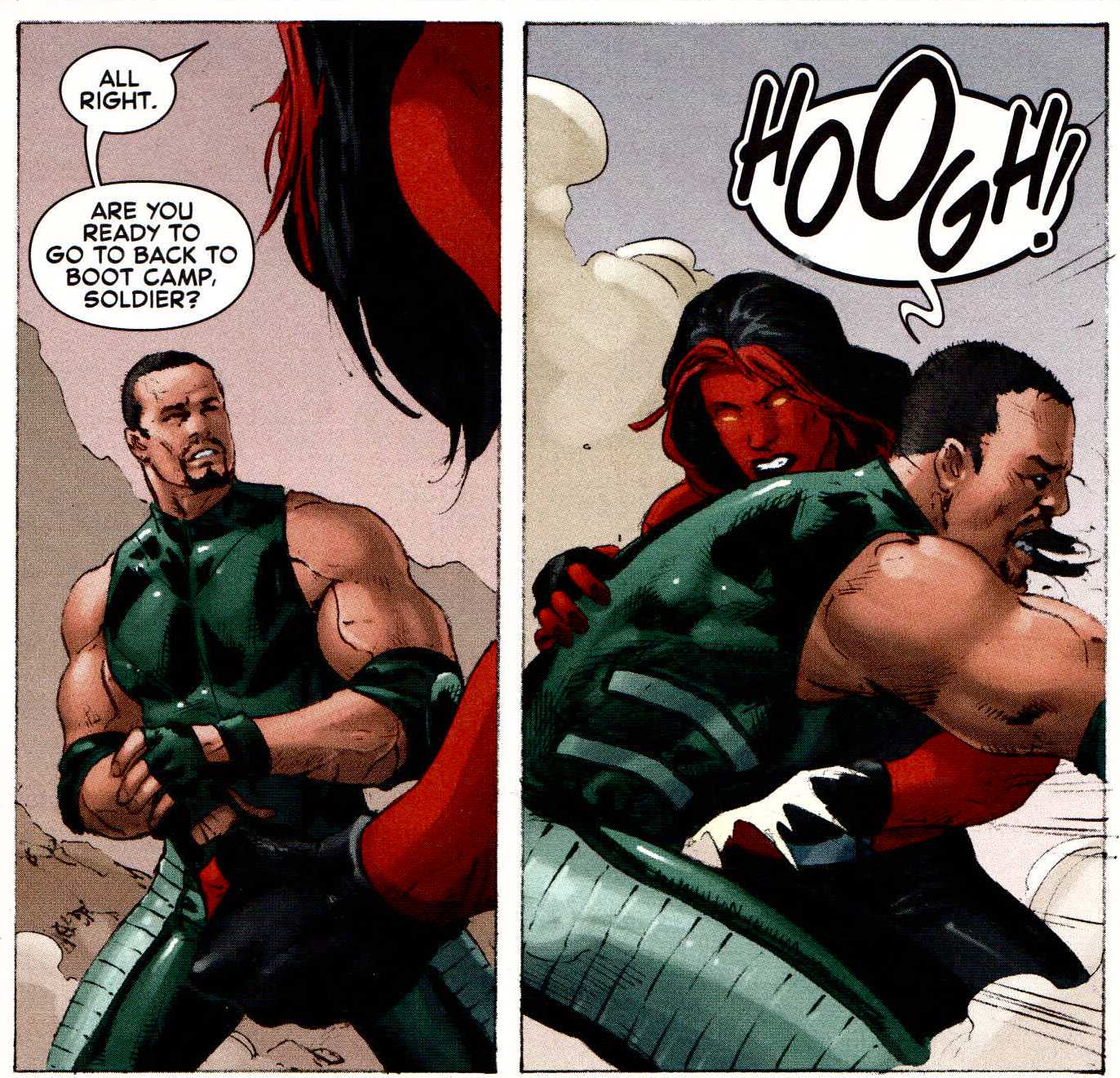Bruce Banner’s love interest Betty Ross has played an important supporting role, for better or for worse, ever since the Incredible Hulk debuted 50 years ago. Her reincarnation as the Red She-Hulk during Jeph Loeb’s time on the Hulk titles has gained popularity thanks to Greg Pak and Matt Fraction’s respective runs on Incredible Hulks and Defenders. As part of Marvel NOW! her new solo series begins with General Reginald Fortean successfully demonstrating the capabilities of three volunteers from his Echelon super soldier programme to a small gathering of the military-industrial complex. The joy proves short lived when Red She-Hulk makes her splash page entrance with a heavy tank held above her head. The three Echelon soldiers initially gain the upper hand by wrapping the tank’s gun barrel around Betty. Betty, however, is the master and in short order she teaches the recruits that being superhuman means one has to absorb plenty of physical and verbal punishment (click on image to enlarge).