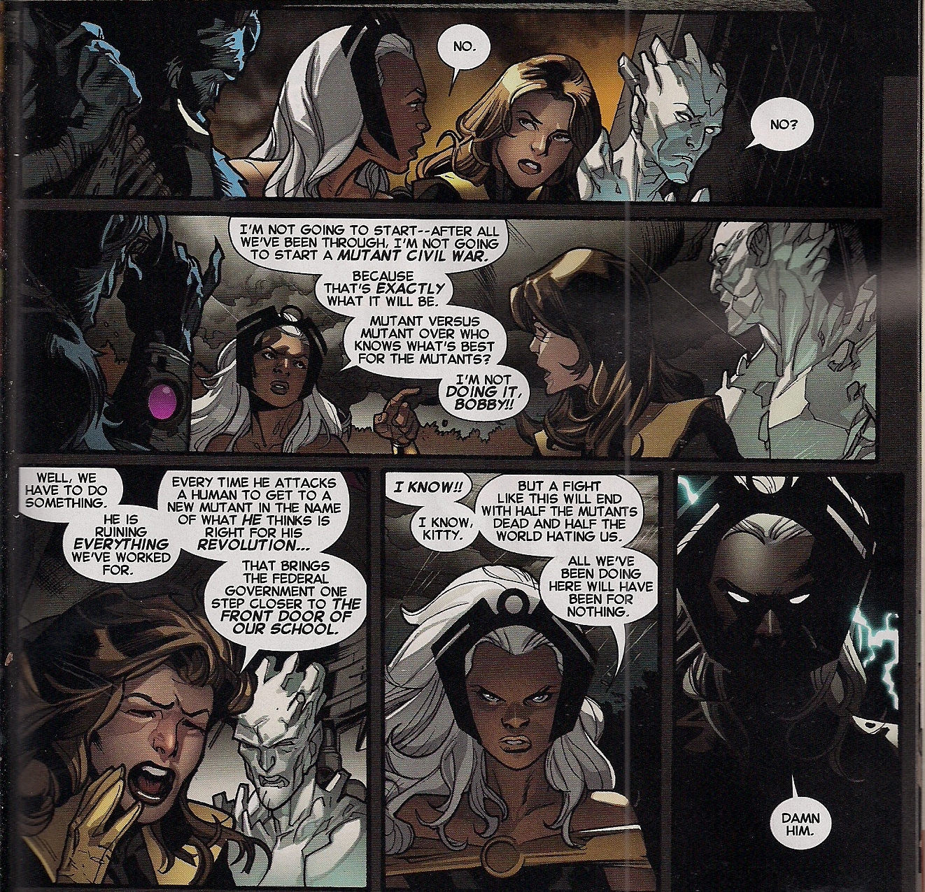 I read this and all I could think was how stupid the set up is. Cyke is SAVING mutants while all the other X-Men sit around tsk tsk at how horrible Cyke is for saving their lives (they seem so condescending in this scene to me). It's kind of like when Cyke saves Iceman from a mob trying to kill him (way back in the original X-Men), everyone didn't seem upset then did they?