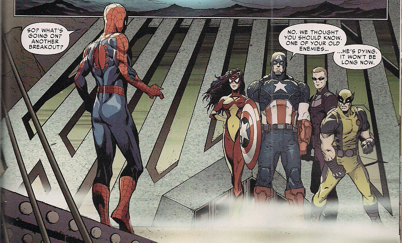 So Slott has “Done A Doctor Bashir”? I would also point out that Spidey leaving as medics try to revive otto is a direct copy of the end of an episode of Joss Whedon's Angel where the main character is mind-swapped with an old, sick, gnarly dude. Coincidence, I am sure, as is the similarity to that story arc in Spider-Girl where the evil adult version of Arana mind-swaps with Spider-Girl, who then dies in someone else's body…
