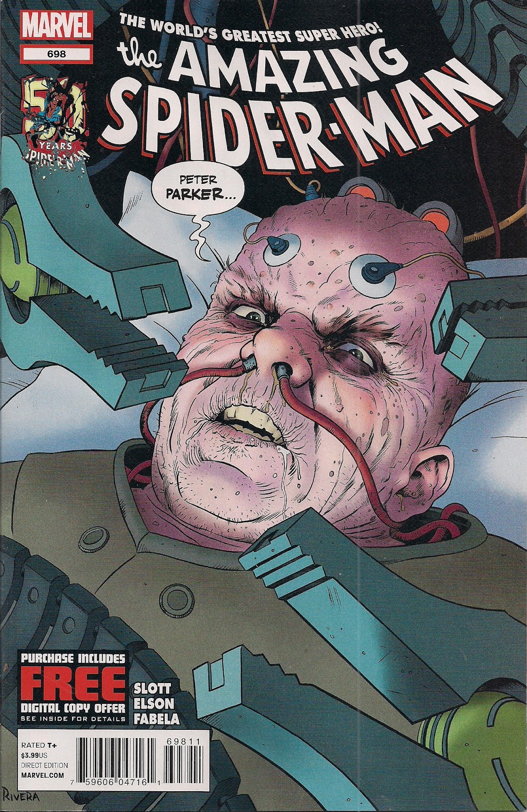 Paulo Rivera’s cover is icky and creepy, all the more so once you know that this is Peter we’re looking at. And I love that the Spider-Man 50 Years symbol is shattered here, it’s a clever, subtle, appropriate touch.