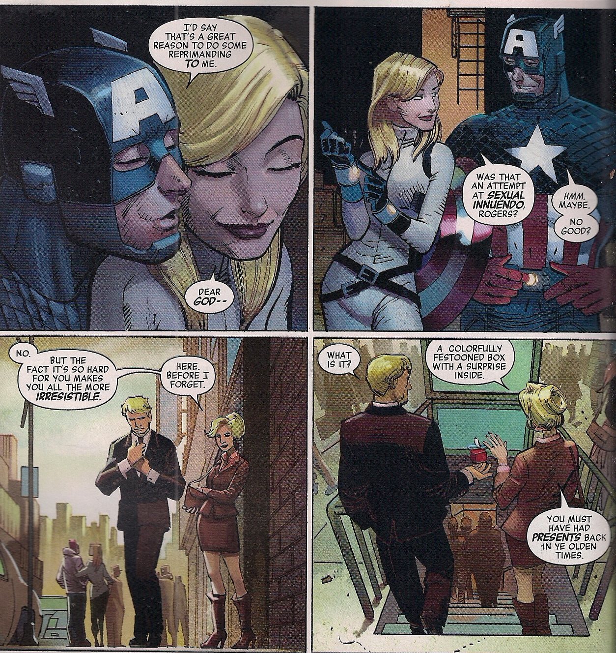 And back home, girlfriend Sharon Carter awaits, wondering if Steve Rogers will ever truly commit to her, or if Captain America will always come between them >choke<.