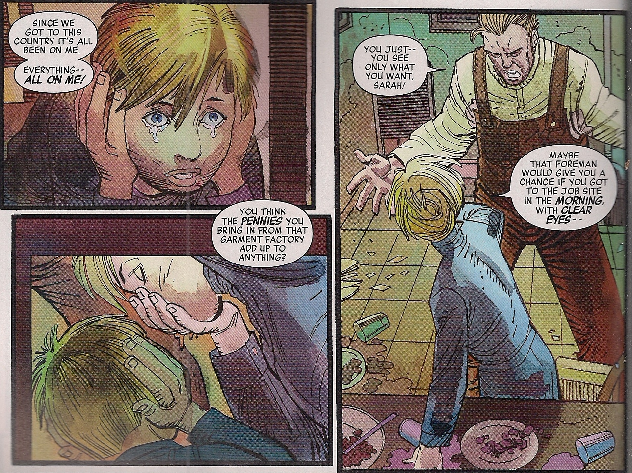 The artists take a different approach for the flashback, with a looser finish, perhaps to evoke the notion of memory. Colourist Dean White excels here, sticking to watercolour tones and damping down the sheen. It’s extremely effective.