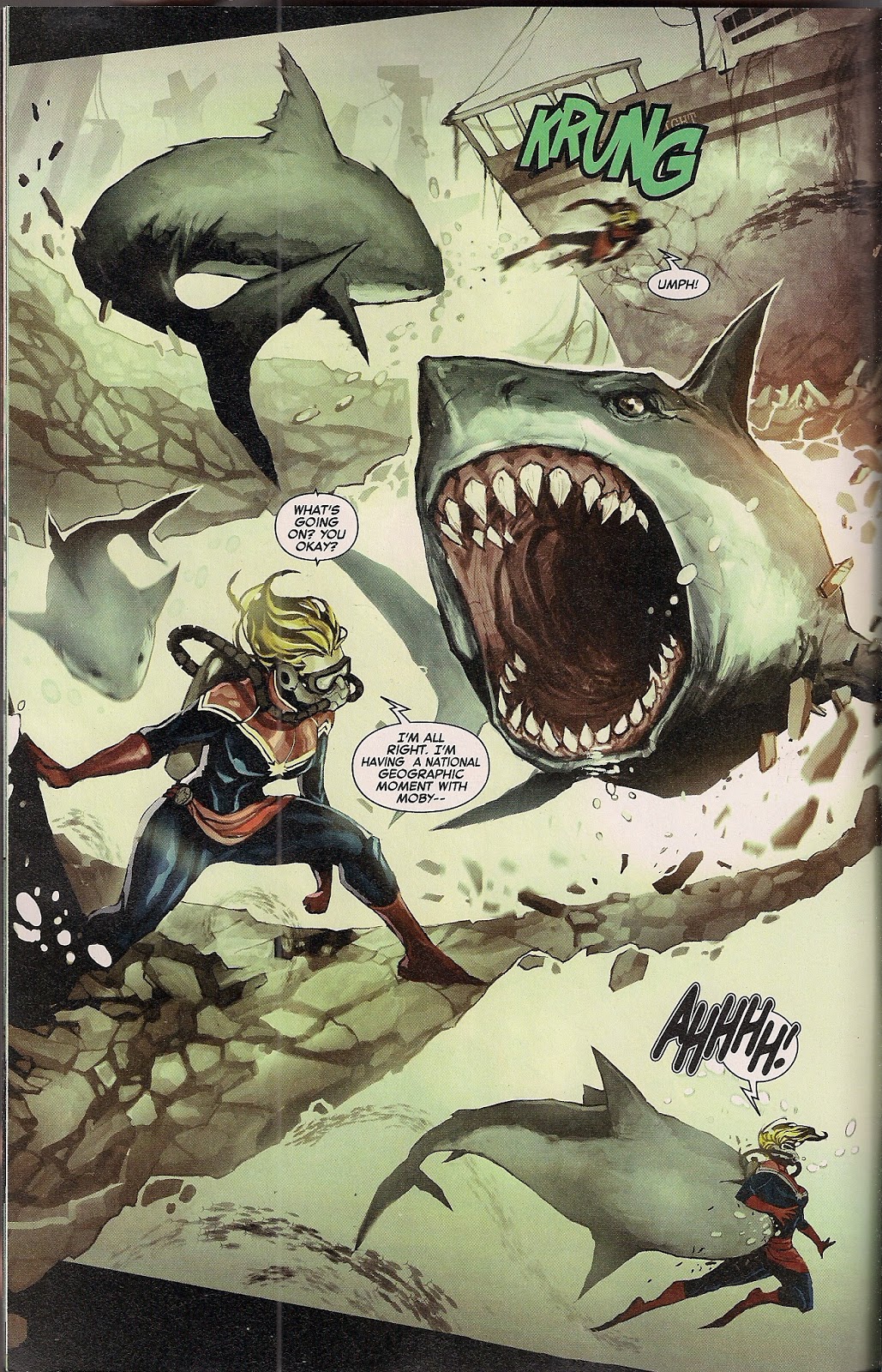 Carol picked up the name years after Monica gave it up. Monica reckons it would have been common courtesy to run the change past her. Both women have a point, and it’s good to see that the disagreement doesn’t – despite that teasing cover – bring about a fight between the two. As I said, they’re friends. The name business is addressed as Carol helps Monica look into a Bermuda Triangle-style mystery that’s hit the latter’s boat salvage business. While Monica has immense light-based power, she’s not comfortable underwater due to a long-ago Avengers mission, so down Carol goes. Plane-crazy Carol’s reward comes as she finds some seriously sexy old aircraft that have somehow been dragged into the depths off New Orleans.
