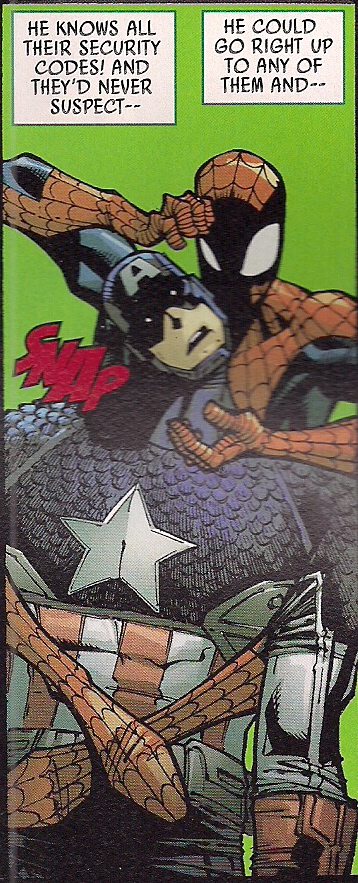 He’s not my favourite Spider-Man artist, but Humberto Ramos’s work is effective this issue, complementing Slott’s script with suitably creepy images (if you think the grotesque Otto body is disturbing, wait until you see Aunt May …). There’s only one panel to hate, and that’s an imagined scene of Spidey snapping Captain America’s neck – it’s carelessly ugly. I wonder if inker Victor Olazaba wanted to fix it, but isn’t allowed to change the work of a bigger name.