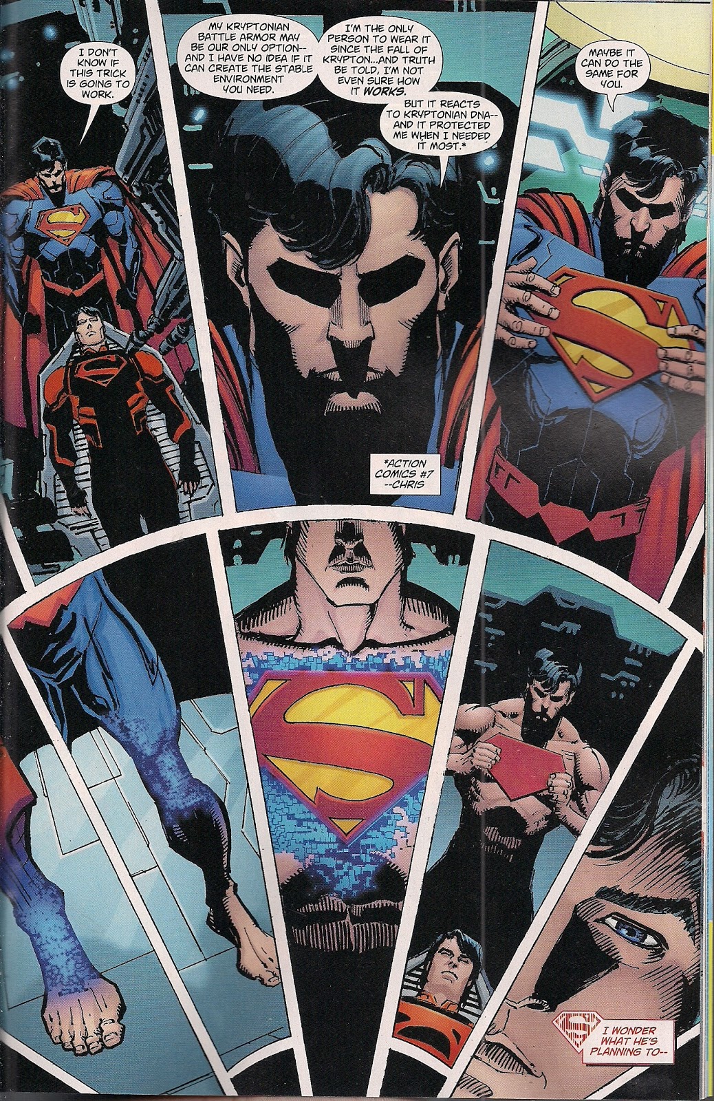 While I like that Superman consults with Cyborg and Veritas, I’m not impressed by how suddenly he dismisses them when he has the armour idea – he comes across as the arrogant type Superboy prejudged him to be. (And poor Cyborg: since being ‘promoted’ to the Justice League, he’s become less and less interesting as a character – DC writers seem content to treat him like an all-purpose AI, rather than a battle-hardened science hero.)