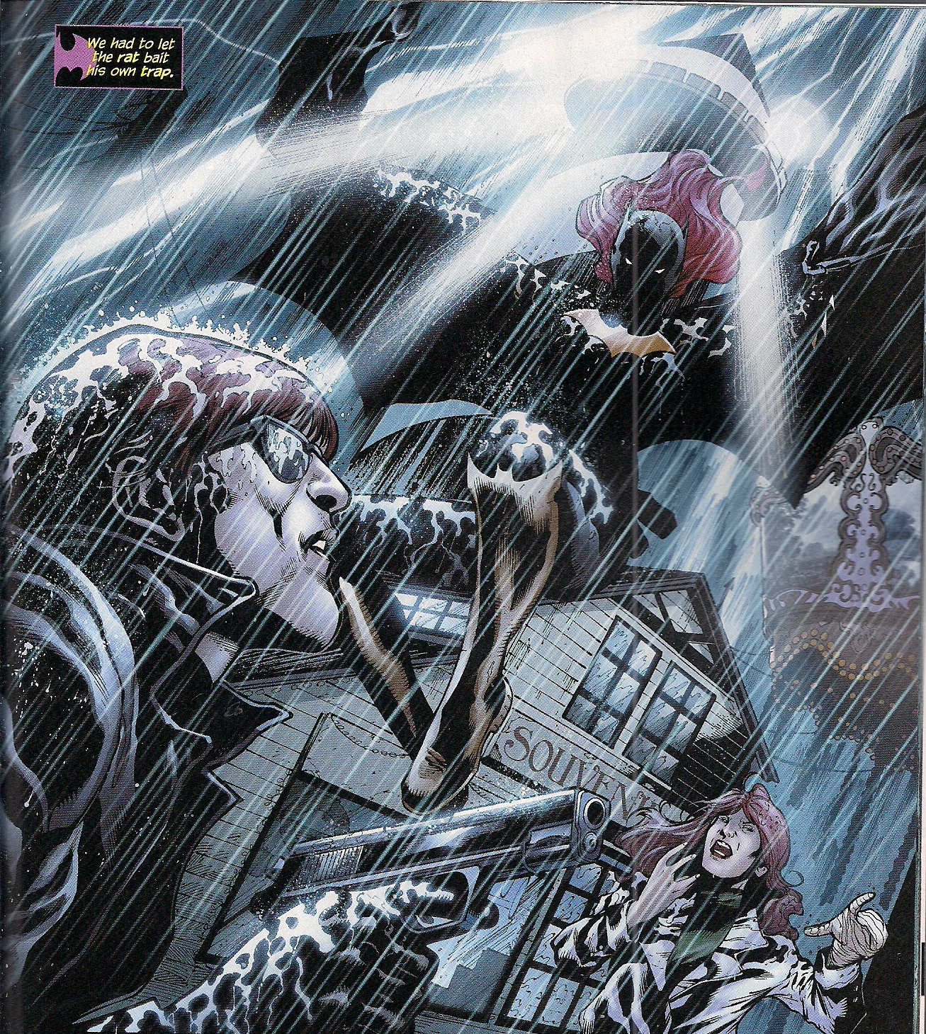Sampere, with inkers Jonathan Glapion and Marc Deering, serves up page after gorgeous page. Not pretty pretty, but gorgeous in their dramatic sweep, with the personal moments as grippingly portrayed as the big action sequences. There’s especially fine body language in the conversation between Barbara and Alysia, right down to that cute cat. And James Jr is chilling without being portrayed as a leering madman. There’s a great panel of him as perceived by a concussed Batgirl, but my favourite moment shows that our ginger librarian can look every bit as imposing as the big, bad Batman (above). Colourist Blond deserves a share of the credit in both cases, for some terrific dark and stormy night work. And letterer Dave Sharpe does his usual fine job of laying out the script. Then there’s that foldout cover by Eddy Barrows, Eber Ferreira and Marcelo Maiolo, which has a splendid sense of motion and depth.