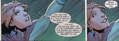 This time, the main event was more fun than usual, as writer Paul Levitz gives Desaad a creepy charisma – he’s corny as heck, but lots of fun, in a leering, spiky-toothed way. As for the incidental pleasures, there’s Huntress’ way with a curtain rod, some speculation about Desaad’s historical links and a suspected crush confirmed. Best of all, there’s this moment, which will surely make lovers of the Silver Age Supergirl smile (click on image to enlarge).