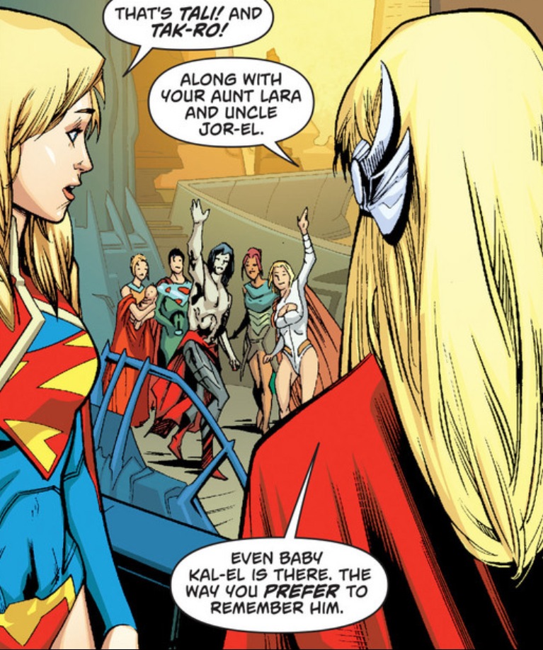 Maybe that woman at fourth left is indeed Tali or Tak-Ro, but one of the named pair is missing. Instead we see new friend Power Girl and heartbreak clone H’el, neither of whom Kara namechecks. A clue, or simply miscommunication between creators?