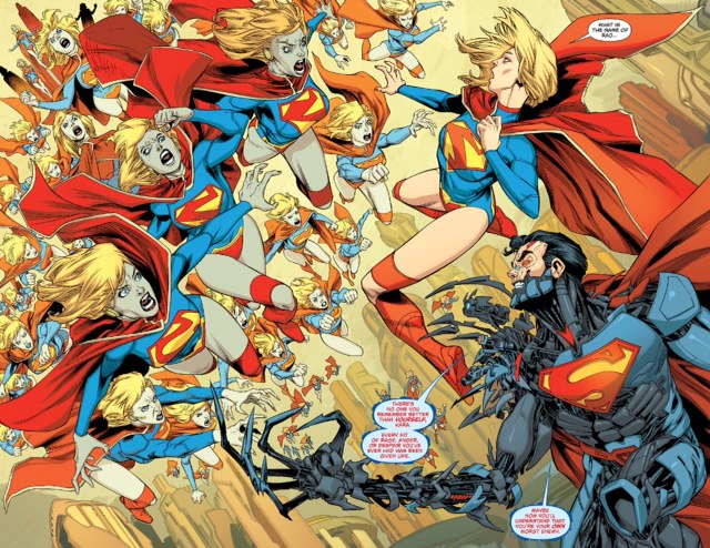 Which doesn’t please Cyborg Superman, who drops the facade of friendliness. As he and Kara battle one another, Delacore unleashes Kara’s memories on herself, giving Neves a chance tio produce a rather sensational spread (click on image to enlarge).