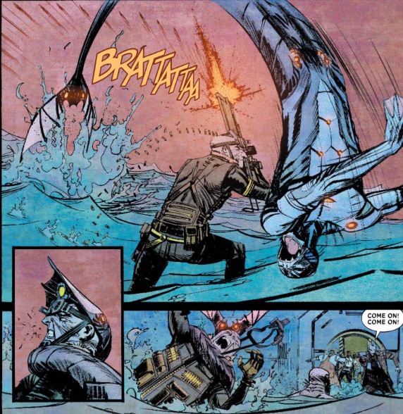 Snyder’s script is tight and entertaining, mixing fast-paced mystery with science-based suspense. The loneliest whale exposition doesn’t slow down the story for a moment – Archer narrates it over Murphy’s convincing scenes of the survivors preparing to flee. Visually, the characters are distinctive, with the only design I’d tweak being Meeks, who looks like a cross between two Spider-Man villains – head of the Vulture, dress sense of Kraven. As for the creature, it’s sheer horror, malevolence with gills (click on image to enlarge).
