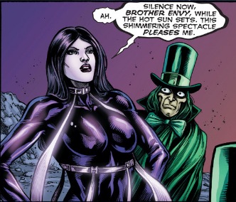 Oh, I’ve not mentioned the opening page, in which embodiments of sin Envy and Pride plot against Pandora. Probably because they’re an embarrassingly cheesy pair, with one a green Penguin, the other an ad for botched breast enhancement surgery.