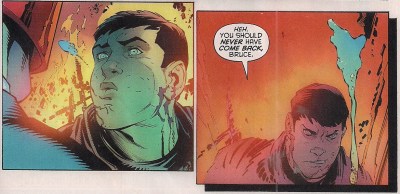 But the Red Hood doesn’t know Bruce, doesn’t suspect his preternatural determination and the strength he’s built up on his world travels. He escapes, battered and bleeding, and returns to Wayne Manor.