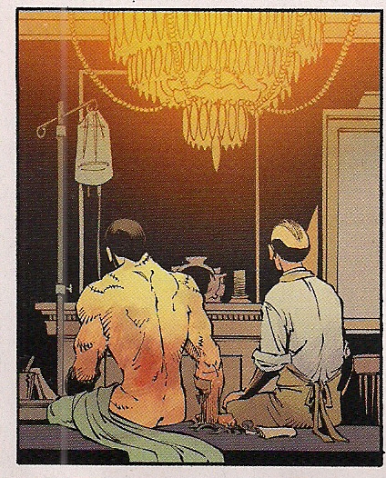 Bruce’s smile as he wakes to see Alfred has fixed him up is as telling than ten lines of dialogue. And a silhouette of Bruce wandering off with a bedsheet cleverly anticipates his heroic outline.