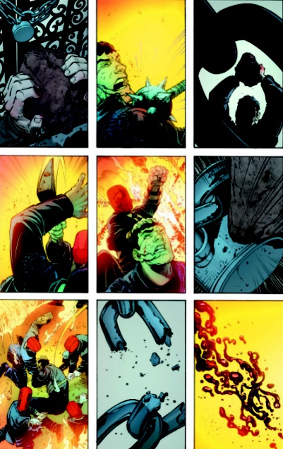 That’s the linear version of events as I understand them. Writer Scott Snyder adds interest to an already intriguing scenario by splitting Bruce’s entrapment and escape, weaving them together, with one scene echoing or commenting on the other. Courtesy of artist Greg Capullo, we see him brutalised, lectured to and left alone in one sequence, and desperately trying to return home in the other. The colours of FCO Plascencia play a crucial role, immediately clueing us in as to whether we’re looking at Now or A Little Earlier. Plascencia clearly deserves a cover credit.
