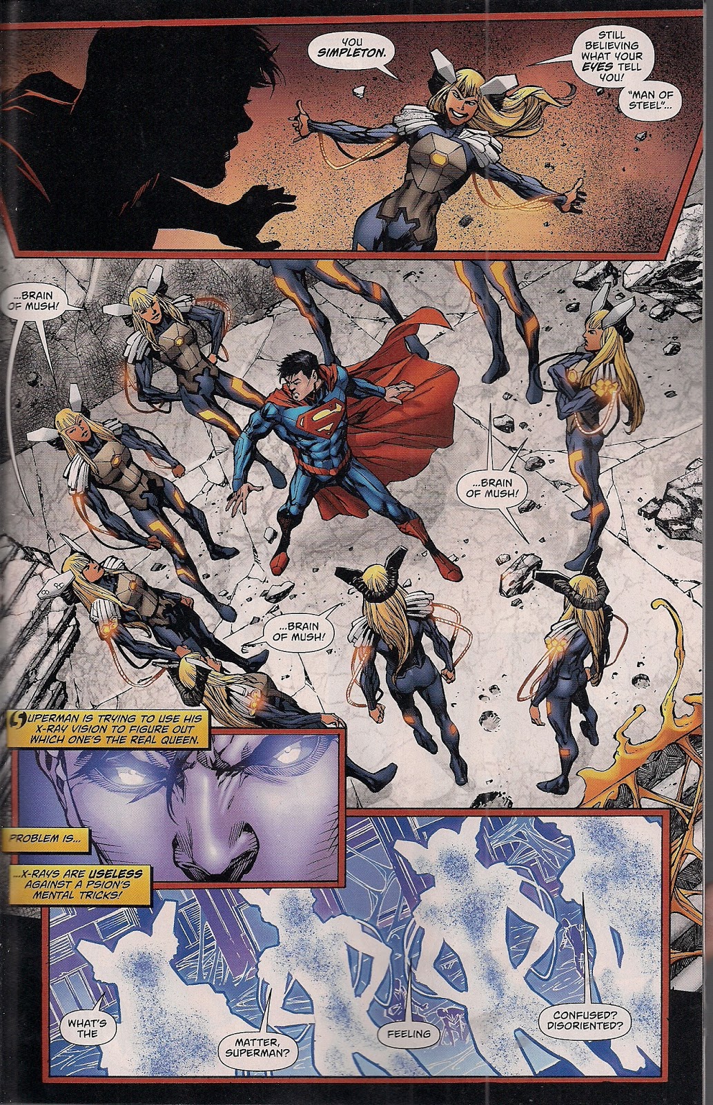 Metropolis stands revealed as the haunt of powerful psychics, known as The Twenty, once-ordinary people seeded with mind-mangling power by the alien conqueror Brainiac. One of them, the HIVE Queen, has Superman in her power. She’s drowning him in sticky mental energy stolen from the citizens, a kind of psychic honey. Her taunts spur Superman on to break free, and he fights back, but she’s just too powerful – attacking him internally with telepathy and externally with telekinesis. Soon her mind shackles have the hero trapped once more.