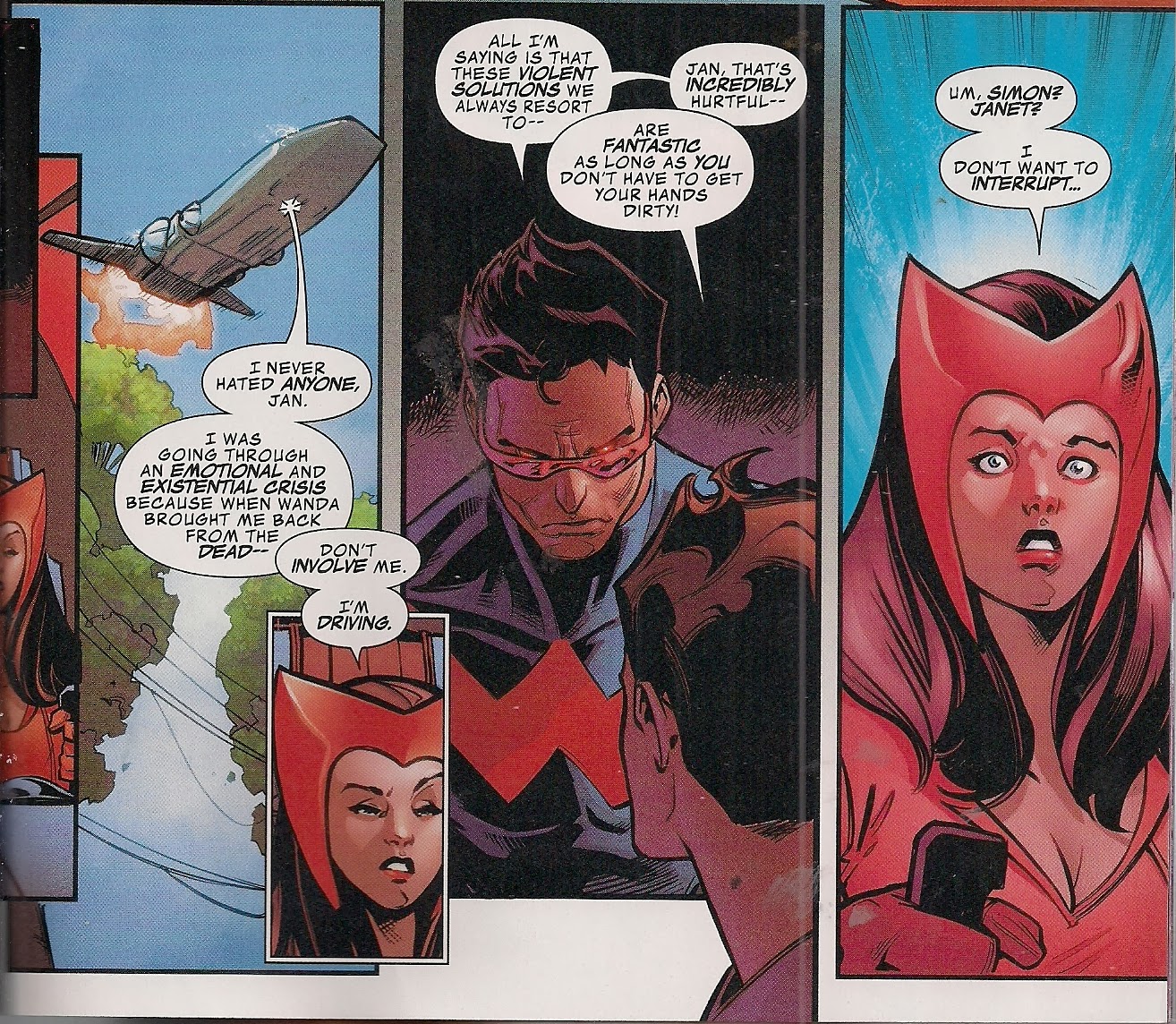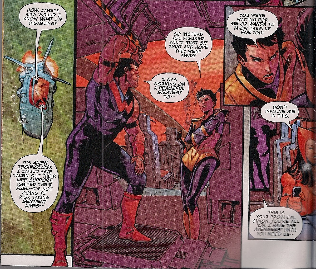 Of course they can! Jan, Simon and Wanda are veteran heroes. While they have their differences – Jan is unimpressed by Simon’s current ‘I’m a pacifist’ attitude because it seems to translate as, ‘you punch ’em!’ – they never lose sight of the big picture: people need help. And because they’ve known one another all their adult lives, they know what they can do, together and separately: Simon uses his ionic powers to calm the giant, Denny; Wanda deploys her probability-altering hexes to send Jan somewhere she never wished to see again; Jan applies her knowledge of shrinking and growing to rally Denny’s wife, Alice, to be her own hero.
