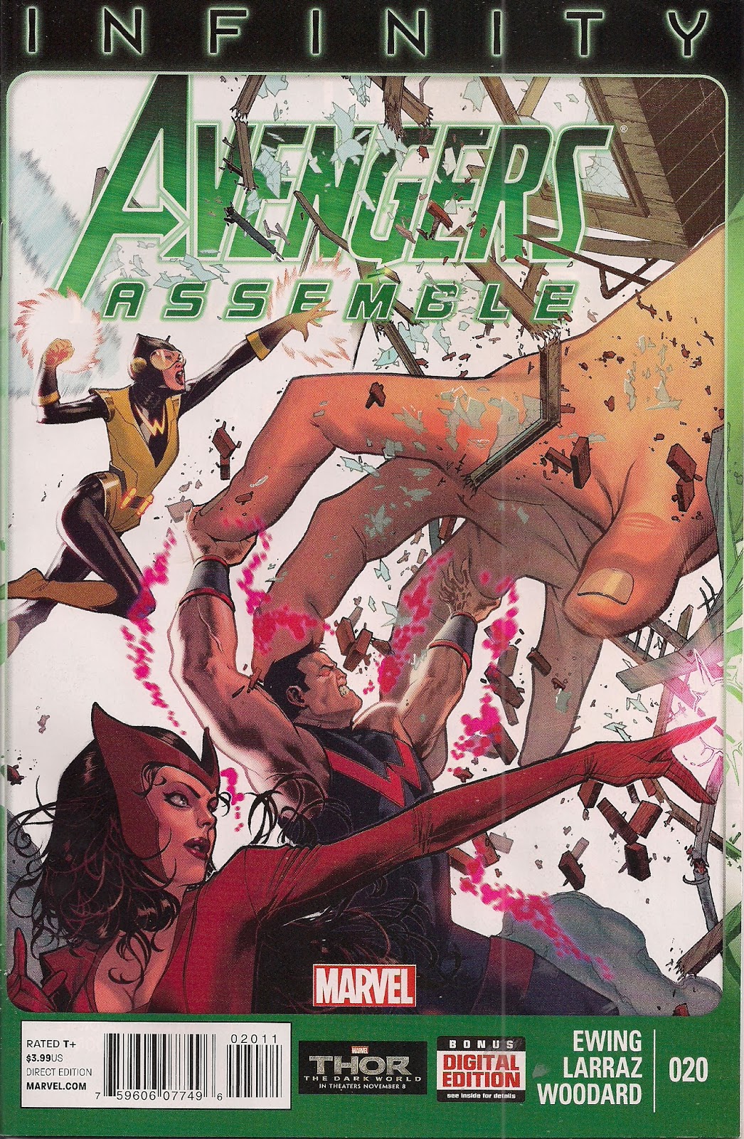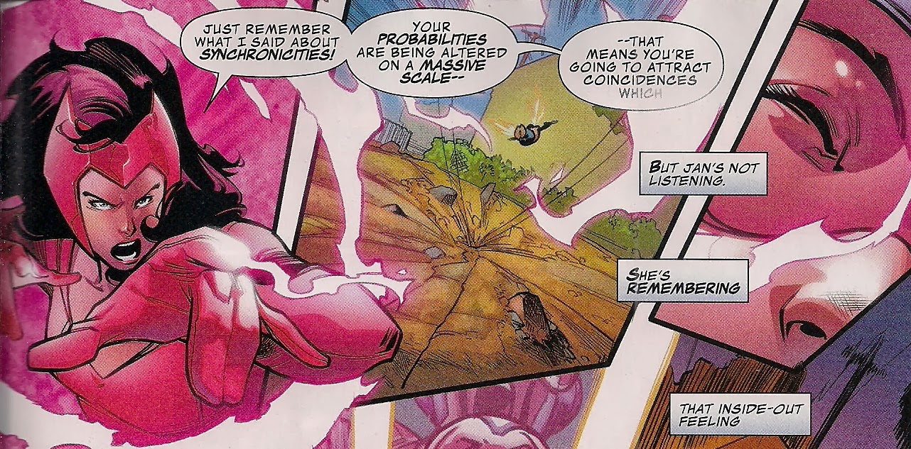 And we get an honest to gosh happy ending in a done-in-one that uses current crossover event Infinity as a springboard for an entirely satisfying tale in which character motivates action. Writer Al Ewing, who’s just kicked off the new Mighty Avengers team in their own series, shows he’s equally adept at running a veteran unit – Simon, Wanda and Jan’s individual and collective histories are the lifeblood of an issue that should be handed out to all Marvel and DC writers as an example of short, snappy, satisfying superheroics. The tricky subject of Simon’s sudden pacifism – tricky because it makes no sense for the character – is deftly approached, while the troubles of Wanda and Jan are equally well-used. Wanda gets the line of the issue – her warning about coincidences makes superb sense as a story engine.