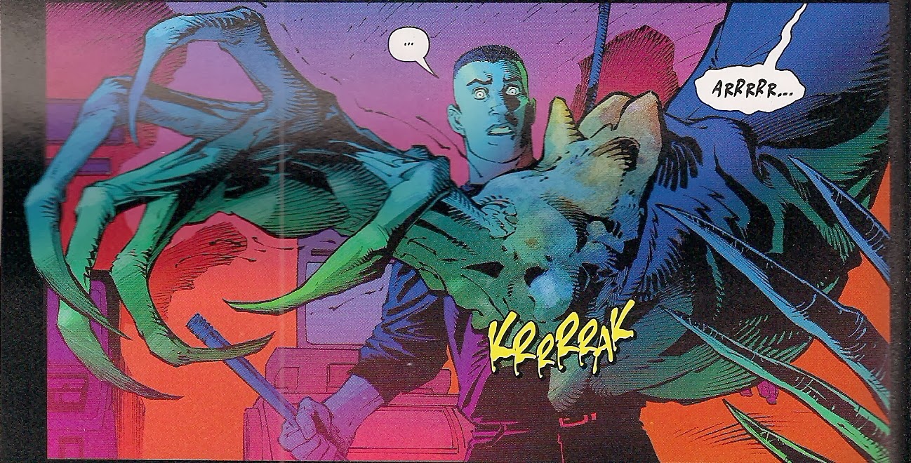 It’s still Zero Year, when Bruce Wayne was developing his Batman role, and he’s fighting Dr Death. A brilliant medic self-transformed into a monster able to control his bone growth, he wants revenge on Wayne employee Lucius Fox for perceived slights. And if he gets to take down Bruce Wayne along the way, all the better. Before that, though, there’s something he wants to tell Bruce, a taunt he wishes to flesh out.
