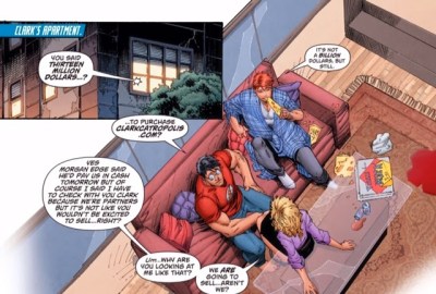 It’s late, but Clark’s newsblog partner Cat Grant calls round with the solution to his financial woes. Their old boss Morgan Edge has offered to buy ClarkCatropolis.com >snicker< for a cool $13m. Clark, who's as schizophrenic (pop culture usage, send no letters!) as his writer, says no to a buyout, because the site means sooooo much to him. This is the guy who contributes perhaps one NIB per month, but suddenly the blog is a symbol of truth, and justice, and Cat being deeper than something very shallow indeed. Cat, while she'd hoped to have money for food, is thrilled by Clark's show of faith. It's Jimmy, though, who points out the real reason they shouldn't sell …