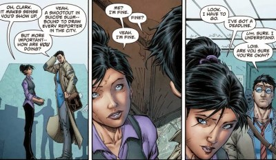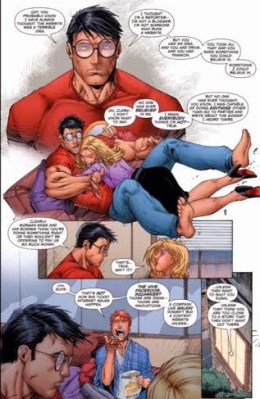 What else? Lobdell continues to write Lois as a determined, good person, making me almost forget a weird bit of business an issue or so back. And guest artist Brett Booth turns in a vibrant pencilling job, proving as adept at moody drama (the Sam sequence) as high comedy (the Clark, Kat and Jimmy Show). It’s the latter that has me hoping Booth returns soon, as he seems much better suited to Superman’s world than the oddness that was Teen Titans. Just look at the nicely observed body language here.