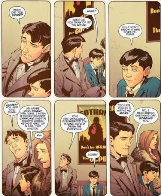 It’s the day of the cinema trip that opens this instalment, as we join Martha, Thomas and a contrite Bruce Wayne at police headquarters in a striking, silent page. Words just aren’t necessary as the demeanour of the Waynes tell its own story. And when the ‘sound comes on’, the family dynamic is so wonderful that it really makes me mourn for the loss that’s coming to Bruce. Snyder elegantly give us little moments that anticipate Bruce’s future without hitting us over the head with the Significant Stick.