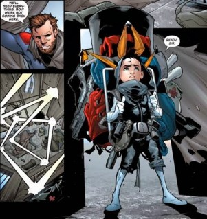 A flashback to JLK’s childhood, which saw him raised a boy soldier by the awful Harvest, is really well done – just look at JLK in that final panel. One smart, well rendered image tells us everything about JLK’s world. This kid, I feel sorry for.
