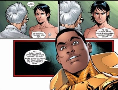 Having first been confused at waking up in what to him is a utopia – no metahumans oppressing the populace – now he’s totally thrown by the idea that anyone should wish to help him out of sheer benevolence and drops his guard, revealing that his name is Jon. He goes for six whole pages without scheming to hurt anyone, some kind of record. But while he’s not plotting, it seems his mind is plotting against him …