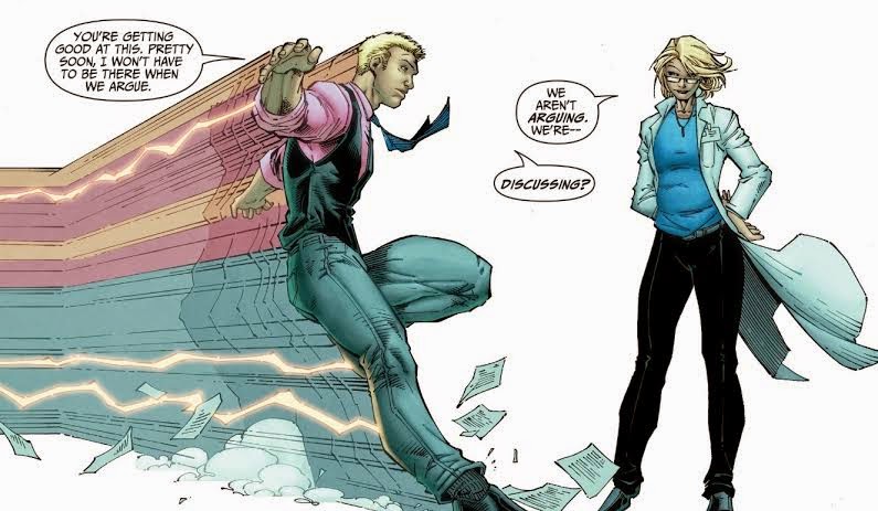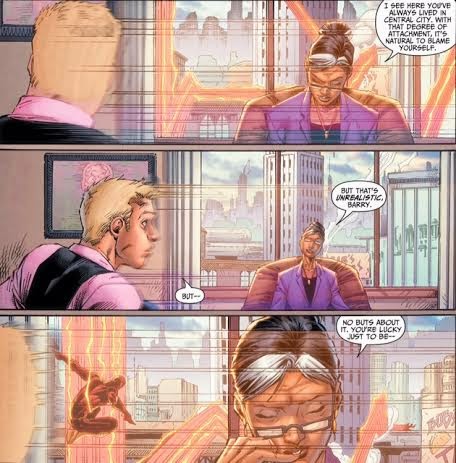 Flash #30 instantly improves when it joins the Now. Central City is a mess after the events of Forever Evil, but on a personal level, things are looking up for Barry Allen. He’s set to be reinstated as a full-time member of the crime lab after a temporary demotion. All he has to do is get the nod from sinisterly named police psychiatrist Rebecca Janus, who’s seeing pretty much every law person in the city following the trauma of ‘the Crime Syndicate’s wave of terror’.