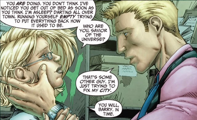 They open with a flashforward to five years in the future, when things are looking distinctly gloomy for our hero because, well, don’t they always? I really don’t care what’s happening with Flash in a potential future. We’ve most of us read the X-Men’s Days of Future Past, that was a brilliant story, original for comics, but the ‘something’s wrong with the future’ bit has been done to death since then (not least in the X-Men comics themselves). There’s no tension in this trampled trope – a defining event is changed, but the multiverse means that while the bad future is averted for the version of the characters we follow, it survives as a sliver of time. Which is depressing – the heroes win, but they lose.