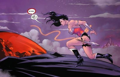 As the encounter plays out throughout the issue, we see moments from earlier in Diana’s day as Wonder Woman plays detective. She visits the office of Clarkcatropolis.com and meets Cat Grant for the first time. She helps Lois Lane out of a sticky situation as the girl reporter tries to gain access to a military base. And she checks in with Batman, who shares the results of tests he’s carried out on a sample of Superman’s blood.