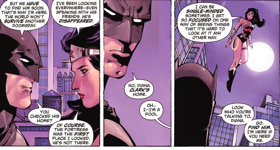 13. It makes way more sense than just putting a coat on. Clark had a different hairstyle, glasses, posture, etc. Diana's civvies are just plain stupid here. Apparently Soule and Daniel even had to make excuses on social media for it, saying that they hadn't wanted Diana dressed that way but were overruled by higher ups. It's simply dumb and unbelievable. Diana has worn a disguise several times in the New 52 already. She knows full well how to manage it, can take it on and off with a swoosh of her lasso, and surely must care enough about Clark's privacy not to blow his secret to hell on the off chance that no one will notice her, including celebrity gossip expert Cat Grant. It was, inexcusable, sloppy work plain and simple.