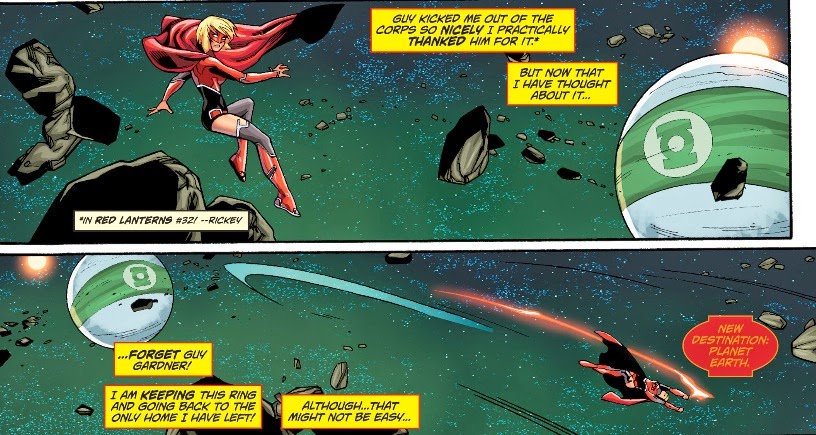 Still a Red Lantern, Kara is on her way back to Earth. While she’s fitted in with the gang, leader Guy Gardner wants her to go to planet Mogo to see if the ring can be safely removed. But she’s not having it, she likes that the red energy makes her feel part of something.