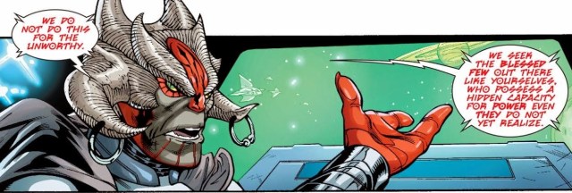 The big surprise this time is the news that Kara may be near a cure for her red-ringness. It’s a surprise because having been in fine alternating synch with the Red Lanterns title, we’re suddenly out of order, with a footnote pointing us to the not-yet-out Red Lanterns #32. Hopefully, the inevitable collection will print the stories in the correct sequence.