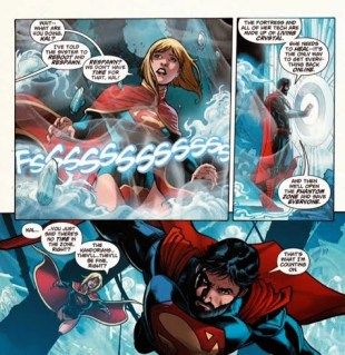 Currently said family numbers one: Supergirl. The role Pak assigns Kara is my favourite part of Action Comics #35 – she’s stepped up to fill Superman’s shoes, managing the post-Doomsday mess. She’s pleased to see him, supportive physically and mentally … it seems our Supergirl is growing up. If only he’d sit down and talk with her – as the last survivor of Argo City she knows about loss. And she likely has her own responses to process. Instead, he pushes her away, imperiously telling her he’ll see her in 40 days after the Fortress reboots. Grateful much, Kal?