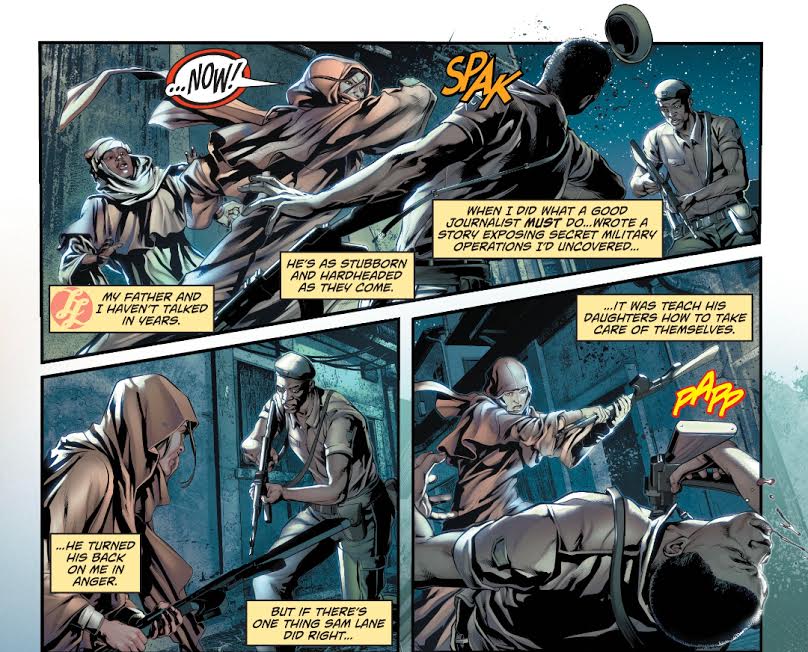 Hambi, Bohanna and the unnamed pilot are nice additions to Lois’ story and I’d be happy to see any of them again… Hambi could easily be slotted into a Metropolis storyline via an exchange job at the Daily Planet, giving us the chance to see the City of Tomorrow through the eyes of an outsider. Bohanna, who carries herself with amazing grace while risking her life in a war zone, deserves more than a single appearance. And the fact that Sam Lane inspires his men, that’s something I wasn’t expecting – between the pilot and Lois, the belligerent general gets a spot of redemption without even appearing on panel.