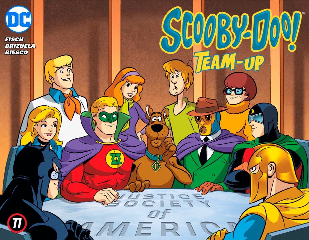 The interactions between Scooby and co and the Golden Age team are huge fun, and I appreciate that Fisch follows the Forties template of splitting the JSA into teams of three for short chapters, before everyone gets together for the climax. The difference here is that it’s two JSA-ers and a member of Mystery Inc, with Shaggy, Velma and the rest all getting a nice logo to float alongside those of the senior heroes.