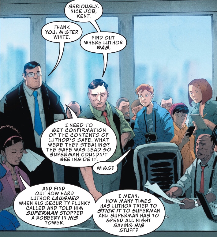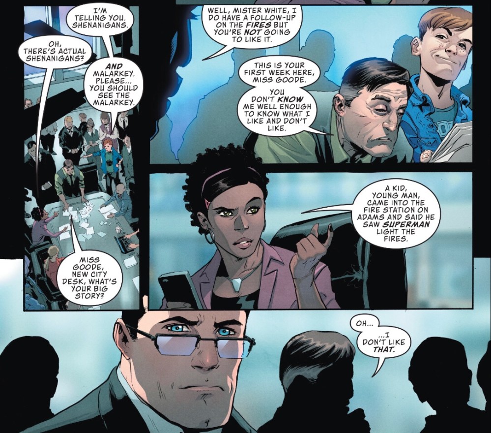 That first spread sees Superman foiling the theft of a safe from Lexcorp and pumping the perps as to whether they know who’s setting the fires. They say no, but new Planet city reporter Robinson Goode has heard something.