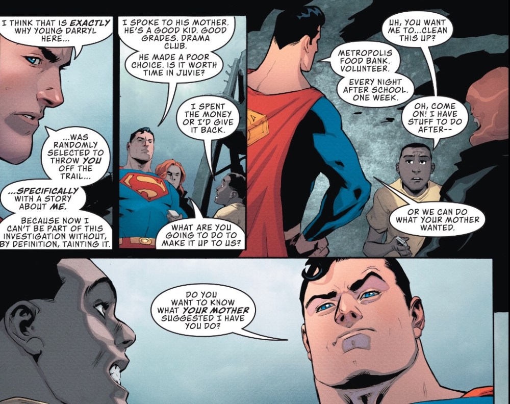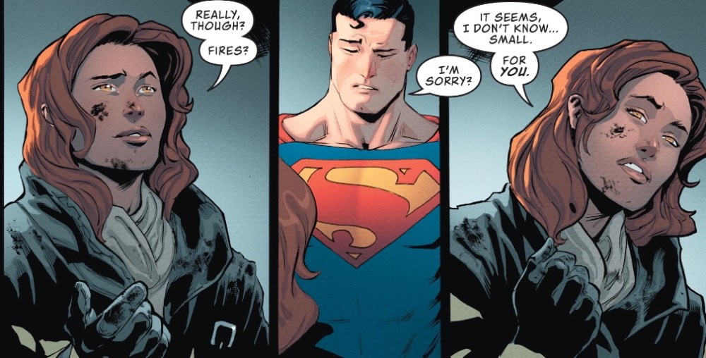 Superman visits new Metropolis fire chief Melody Moore, who almost seems to be giving credence to the idea. Our hero takes her to the source of the story, Darryl, who admits he was paid to lie to Moore by ‘some big bald dude’. Rather than turn Darryl in, Superman has a suggestion that will do more good.