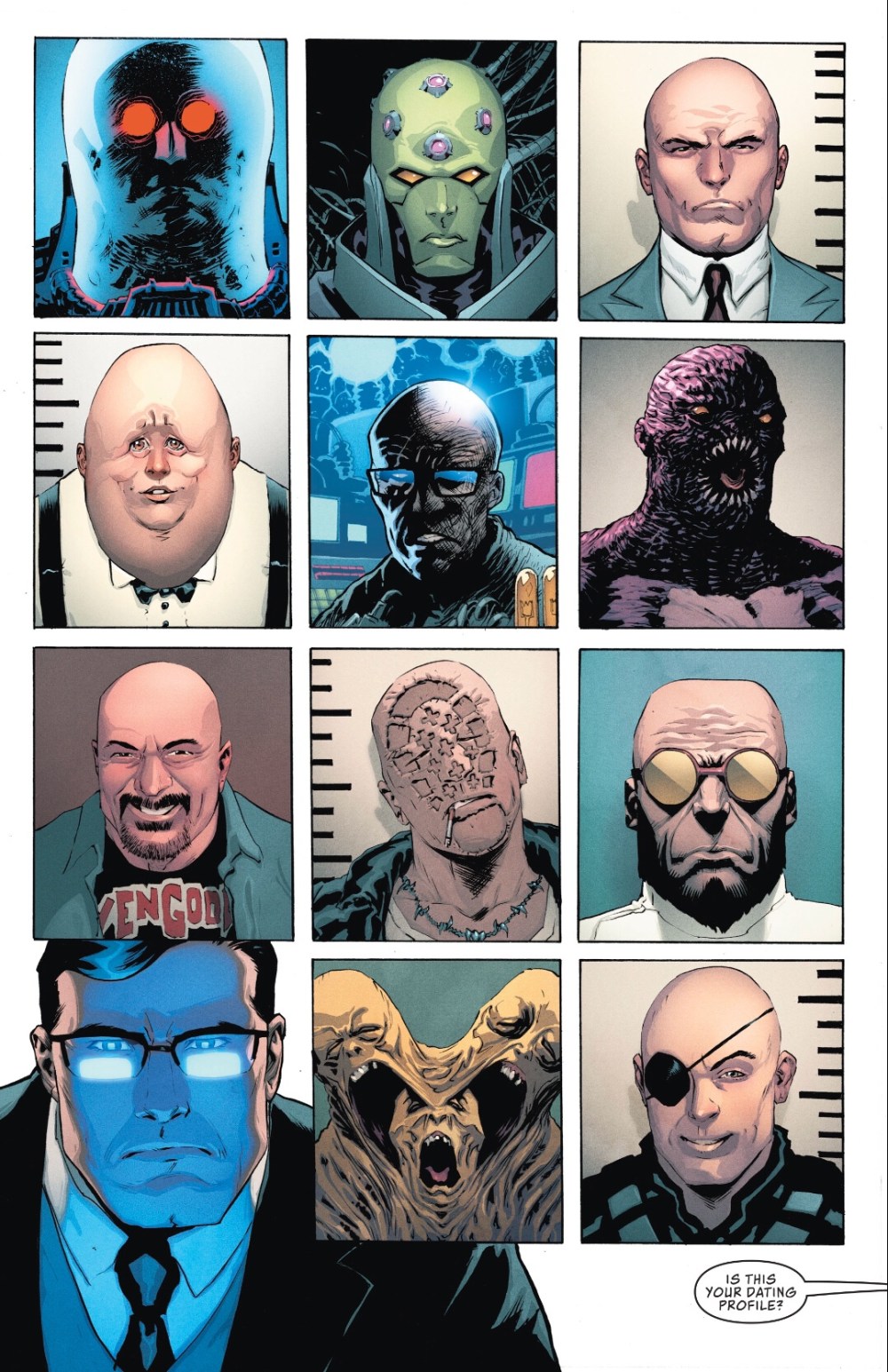 What is a problem is the inclusion of DC boss Dan DiDio and Bendis himself among the villain headshots – a self-indulgent gag that pulls me out of the issue. Knock it on the (bald) head, Brian.