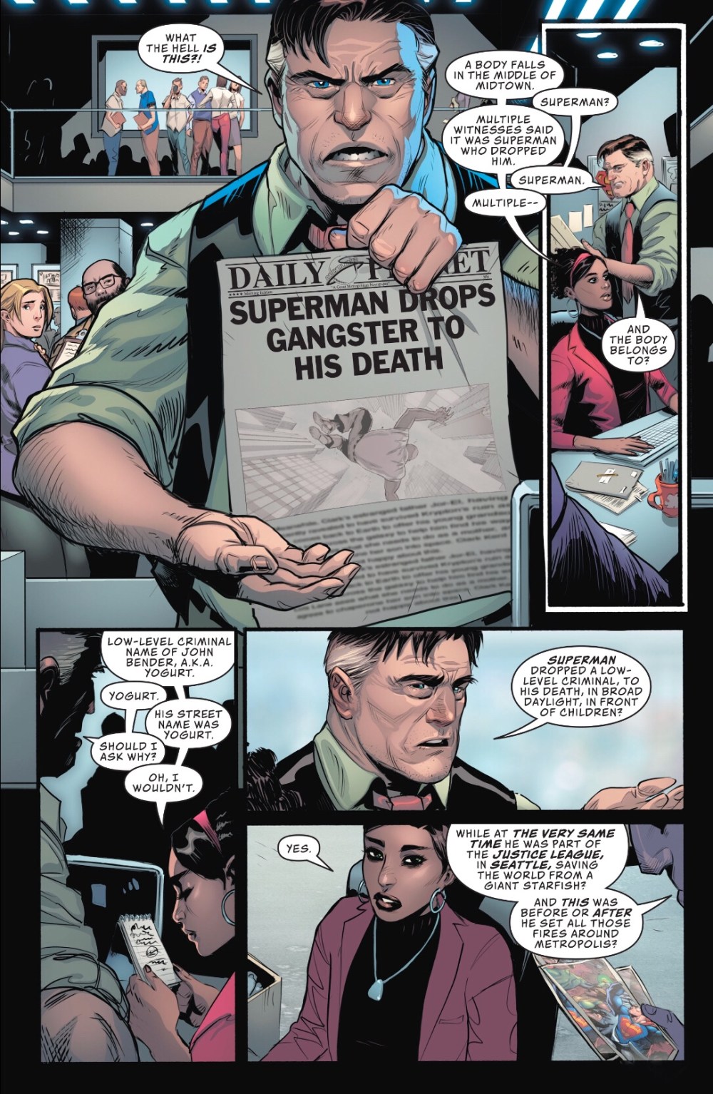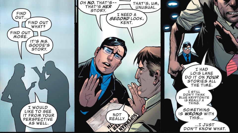 Daily Planet chief Perry White isn’t impressed by new reporter Robinson Goode’s apparently uncritical acceptance of the idea that the Man of Steel is murdering criminals. After tearing a strip off her, Perry lets Clark into a little secret.